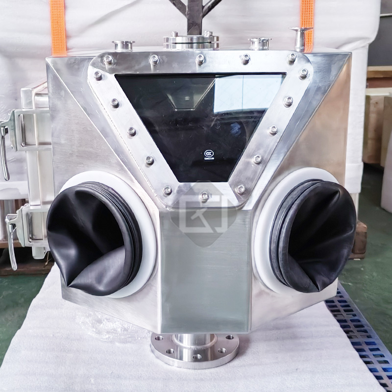 4、手套箱頂部留有φ100視鏡、排氣接口DN40衛生快接、清洗液進口衛生級快裝接口、壓力表孔DN20衛生快接接口、雙固定吊鉤。