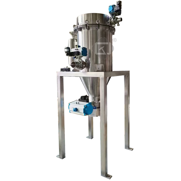 b) -在分離容器的過濾倉內分離空氣與物料,將物料收集在料倉中。旋風分離器阻止細小粉末進入過濾器,以提高過濾器的效率。